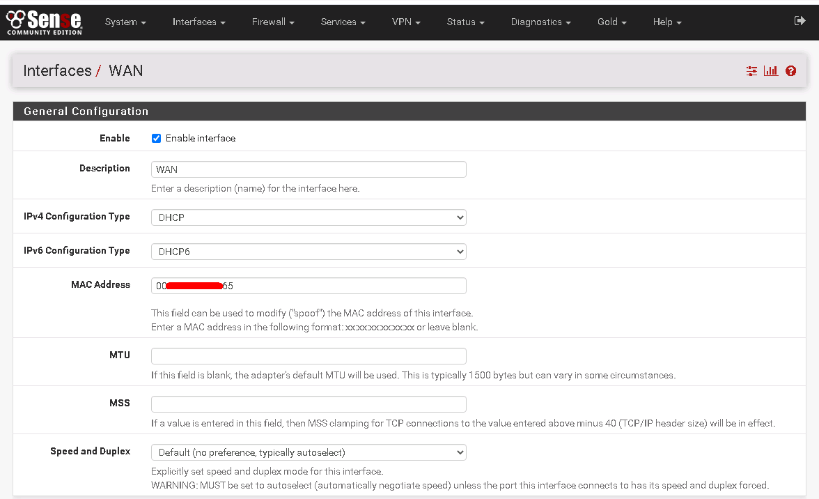 - When setting up WAN Interface, choose the option to Spoof MAC Address and enter the MAC from the Add-on IP bought from Hetzner.